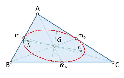 - El centro de la inelipse de Steiner de un triángulo es el centroide del triángulo: la intersección de las medianas[1][5] del triángulo. La inelipse de Steiner es la única que tiene su centro en el centroide del triángulo.[5]