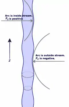 Pero la ecuación de Young-Laplace está influenciada por el radio de las dos componentes. En este caso, uno es el radio, ya comentado, del chorro. El otro es el radio de curvatura de la onda. El conjunto de los arcos en el diagrama muestran picos y valles. Observa que el radio de curvatura en el valle es, de hecho, negativo, lo que significa que, de acuerdo con Young–Laplace, en realidad disminuye la presión en el canal. Asimismo, el radio de curvatura en el pico es positiva y aumenta la presión en esa región. El efecto de estas componentes es contraria a los efectos del radio del propio chorro.