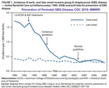 En 2008 después del uso general de la profilaxis antibiótica intraparto (PAI) los Centros de Control y Prevención de Enfermedades de Estados Unidos (Centers for Disease Control and Prevention of United States, CDC) han comunicado una incidencia de 0.28 casos por mil RN vivos en USA.[42]