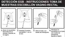 Las muestras tomadas del cuello uterino, del periné o de la zona perianal no son adecuadas.[33][34][35] Las muestras pueden ser tomadas por profesionales de la salud o por la misma embarazada tras adecuada información.[33][34][80][81][82]