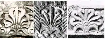 La palmeta de llama , elemento decorativo central del pilar Pataliputra se considera un motivo puramente griego. La primera aparición de "palmetas de llama" se remonta a la akroteria floral independiente del Partenón (447-432 aC),[32] y un poco más tarde en el Templo de Atenea Nike.[33] Las palmetas de llamas se introdujeron en frisos de motivos florales en reemplazo de la palmeta común. Las palmetas de llamas se usan extensamente en los frisos florales de la India, comenzando con los frisos florales en las capitales del pilar de Ashoka, y es probable que se hayan originado con el arte griego o del Cercano Oriente.[34] Una palmetta de llama monumental se puede ver en la parte superior del Portal de Sunga en Bharhut (siglo II aC).