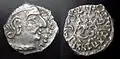 - Moneda de Gupta Chandragupta II con leyenda pseudo-griega en el anverso. Siglo IV d. C.