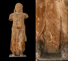 Las artes helenísticas pueden haber sido influyentes en las primeras estatuas —periodos de Mauryan y Sunga—. Algunos Iaksas monumentales se consideran las primeras estatuas independientes en la India.[28] El tratamiento del vestido especialmente, con líneas de pliegues geométricos, se considera una innovación helenística. No se conocen ejemplos previos de tales estatuas en la India, y se parecen mucho al manierismo arcaico tardío griego que podría haberse transmitido a la India a través de la Persia aqueménida.[29] Este motivo aparece de nuevo en las obras Sunga de Bharhut, especialmente en una representación de un soldado extranjero, pero el mismo tratamiento del vestido también es visible en figuras puramente indias.