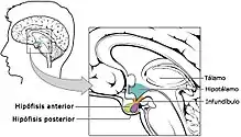 Esquema del hipotálamo en el que puede observarse el infundíbulo que lo conecta con la hipófisis posterior