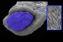 Microfotografía en la que se aprecia en color azul el ovocito de un hámster penetrando en el infundíbulo de una trompa de Falopio.