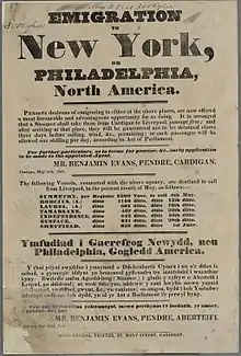 A finales del siglo XVII, hubo una gran emigración de galeses cuáqueros a Pensilvania, donde una Welsh Tract se estableció en la región inmediatamente al oeste de Philadelphia. En 1700, los galeses representaban alrededor de un tercio de la población estimada de la colonia de veinte mil. Hay una cantidad de topónimos galeses en esta área. Hubo una segunda ola de inmigración a fines del siglo XVIII, notablemente una colonia galesa llamada Cambria establecida por Morgan John Rhys en lo que es ahora el Condado de Cambria, Pennsylvania.
