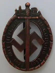 Hitler ordenó que se acuñara la Insignia de Coburg el 14 de octubre de 1932 para conmemorar el evento que tuvo lugar diez años antes, el sábado 14 de octubre de 1922, y para honrar a los participantes. Esto fue antes de que Hitler llegara al poder en enero de 1933. La placa tenía 40 mm de ancho y 54 mm de alto. Estaba hecha de bronce y tenía una espada colocada con la punta hacia abajo sobre una esvástica dentro de una corona ovalada. En la parte superior de la corona estaba el castillo y el pueblo de Coburg. La corona contiene las palabras, MIT HITLER IN COBURG 1922-1932 (Con Hitler en Coburg 1922-1932).[3]