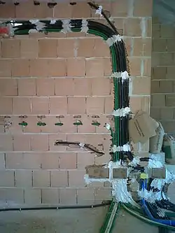 - Toma de tierra: también denominado hilo de tierra o simplemente tierra, se emplea en las instalaciones eléctricas para evitar el paso de corriente al usuario por un fallo del aislamiento de los conductores activos. La toma a tierra es un camino de poca resistencia a cualquier corriente de fuga para que cierre el circuito "a tierra" en lugar de pasar a través del usuario. Consiste en una pieza metálica enterrada en una mezcla especial de sales y conectada a la instalación eléctrica a través de un cable. En todas las instalaciones interiores según el reglamento, el cable de tierra se identifica por ser su aislante de color verde y amarillo.[6]