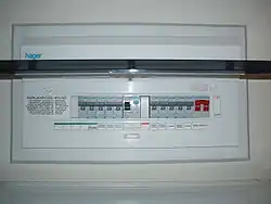 - Interruptor diferencial: también llamado disyuntor por corriente diferencial o residual, es un dispositivo electromecánico que se coloca en las instalaciones eléctricas con el fin de proteger a las personas de las derivaciones causadas por faltas de aislamiento entre los conductores activos y tierra o masa de los aparatos. En esencia, el interruptor diferencial consta de dos bobinas, colocadas en serie con los conductores de alimentación de corriente y que producen campos magnéticos opuestos y un núcleo o armadura que mediante un dispositivo mecánico adecuado puede accionar unos contactos. El interruptor corta la corriente eléctrica cuando existe una derivación de corriente a tierra, es decir, que por el conductor de entrada pasa una intensidad de corriente diferente de la que pasa por el de salida (diferencia que se mide normalmente en miliamperios, mA), intensidad que si pasa por un cuerpo humano puede tener consecuencias fatales.[4]