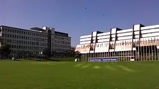 - Edificio D del Consejo de Europa (Bertrand Monnet, Pierre Appril y Françoise Papillard), antigua sede del Tribunal Europeo de Derechos Humanos inaugurado el por Pierre Pflimlin[23], actualmente alberga el Tribunal Administrativo del Consejo de Europa y la biblioteca del Consejo de Europa, rue Sforza ;