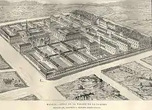 El Colegio-asilo de Nuestra Señora de la Paloma fue proyectado para trasladar el Asilo de San Bernardino,[2] de niños huérfanos y ancianos, que estaba situado en un antiguo convento en el barrio de Moncloa y no ofrecía condiciones adecuadas de espacio y salubridad. Del proyecto[3] se encargó en 1901 el arquitecto municipal Francisco Andrés Octavio, más conocido por ser también el autor, junto con su colega José López Sallaberry, del proyecto de remodelación urbana que dio lugar a la apertura de la Gran Vía. Ese mismo año el Estado entregó al Ayuntamiento de Madrid los terrenos de la Dehesa de la Villa, cediendo en usufructo parte de ellos para la ubicación del Colegio-asilo.