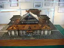 El primer edificio de la escuela de Meiji Senmon Gakko fue fabricado en su totalidad de madera y diseñado por Tatsuno Kingo. También hay un modelo de 1/50 º escala del edificio en la exhibición en los archivos de la universidad en el campus de Tobata.