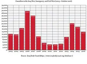 1,156 policías y 949 soldados asesinados 2.286 policías y 1.759 soldados heridos Pérdidas insurgentes 919+ muertos, 3.504 arrestados Bajas civiles 6.746 muertos y 10,511 heridos TOTAL DE CASIDADES 9,770 muertos (Cifras del gobierno, diciembre de 2011 - diciembre de 2013)[16] Bajas civiles 14,855 muertos (cifras de recuento de cadáveres en Irak, diciembre de 2011 - diciembre de 2013)[17] | |||||