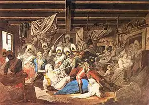 El 4 de noviembre, las fuerzas conjuntas rusas comenzaron la batalla de Praga, siendo este el nombre del suburbio al este del río Vístula de Varsovia donde tuvo lugar. Después de cuatro horas de brutales combates cuerpo a cuerpo, las 22 000 fuerzas rusas rompieron las defensas polacas y Suvórov permitió que sus cosacos saquearan e incendiaran Varsovia.[53] Aproximadamente 20 000 personas fueron asesinadas en la masacre de Praga.[54] Zajaczek huyó herido, abandonando al ejército polaco.[47]