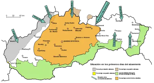 Con el avance soviético del verano, los alemanes dividieron al país en dos zonas, la más cercana al frente bajo el control de las fuerzas alemanas en retirada.[36] El control alemán sobre las fuerzas eslovacas en las dos zonas era, sin embargo, escaso y el traspaso de la minoría alemana del Ejército eslovaco a las unidades de las SS disminuyó la información sobre la situación en las fuerzas armadas eslovacas.[36]