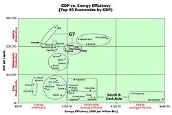 Análisis de las 40 economías más importantes: PIB per cápita vs. eficiencia energética.
