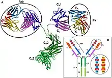 En un anticuerpo, la región Fab (fragmento, unión a antígeno) se forma a partir del extremo amino terminal de las cadenas ligeras y pesadas del polipéptido de inmunoglobulina. Esta región, llamada dominio variable (V), está compuesta por secuencias de aminoácidos que definen cada tipo de anticuerpo y su afinidad de unión a un antígeno. La secuencia combinada de cadena ligera variable (VL) y variable de cadena pesada (VH) crea tres regiones hipervariables (HV1, HV2 y HV3). En VL, estos son aproximadamente de los residuos 28 a 35, de 49 a 59, y de 92 a 103, respectivamente. HV3 es la parte más variable. Así, estas regiones son el paratopo, el sitio de unión de un antígeno. El resto de la región V entre las regiones hipervariables se denominan regiones marco. Cada dominio V tiene cuatro dominios marco, a saber, FR1, FR2, FR3 y FR4.[4][6]