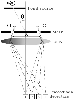 Un sencillo interferómetro óptico de dos elementos. La luz de dos telescopios pequeños (representados como lentes) es combinada utilizando deflectores de rayos sobre los detectores 1, 2, 3 y 4. Los elementos que crean un desfase de 1/4 de longitud de onda en la luz generan patrones de interferencia visibles que pueden ser medidos, proporcionando información sobre la forma de la fuente luminosa. Un gran telescopio individual con una máscara de apertura sobre su montura (rotulada como Mask), deja pasar la luz solo a través de dos orificios pequeños. Los caminos ópticos a los detectores 1, 2, 3 y 4 son los mismos que en la figura izquierda, así que este montaje dará resultados idénticos. Desplazando los orificios en la máscara de apertura y tomando medidas repetidas, pueden crearse imágenes utilizando síntesis de apertura que tendrían la misma calidad que las que habría dado el telescopio derecho sin la máscara de apertura. En una manera análoga, la misma calidad de imagen puede ser conseguida moviendo los telescopios pequeños alrededor de su posición inicial en la figura izquierda. Esto es la base de la técnica de síntesis de apertura, utilizando telescopios pequeños ampliamente separados para simular un telescopio gigante.