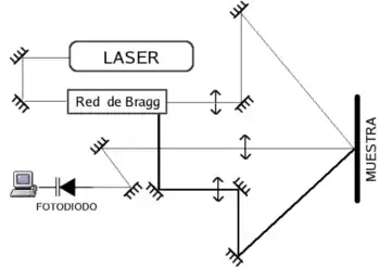 Dos haces, con la misma intensidad, son enfocados en un punto de la superficie iluminando un área de alrededor de de diámetro. Entre los dos haces hay una diferencia de frecuencia () (Dändliker & Willemin 1980) producida al hacer pasar la salida un láser a través de una rejilla acusto-óptica de Bragg. El haz láser es dividido en dos para luego irradiar la muestra con dos ángulos de incidencia iguales y opuestos a la normal de la superficie. La luz dispersada es detectada en la dirección del bisector del ángulo formado por los dos haces incidentes. Al ser un sistema heterodino, la frecuencia de la señal de interferencia resultante es igual a la diferencia entre las dos señales incidentes. La luz dispersada es detectada por un fotodiodo cuya apertura debe ser escogida de forma que al menos 100 speckles sean recogidos por el detector, así se asegura una suficiente potencia óptica media (Dändliker & Willemin 1980). El montaje para la medida por interferometría speckle para desplazamientos tangenciales (modo in-plane) se esquematiza en la siguiente figura:
