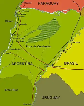 A fines de abril, el ejército paraguayo inició lentamente el avance hacia el sur, siguiendo una ruta paralela al río Paraná. Una tras otra, tomaron y saquearon las ciudades y pueblos de Bella Vista, Empedrado, Santa Lucía y Goya.