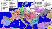 917 | 21 de enero | Los húngaros saquean y queman Basilea, y luego invaden el ducado de Alsacia | ![]() Campañas en Europa en 917 | |