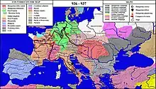 919-920 | Después de la elección de Enrique el Pajarero como nuevo rey de Francia Oriental, un ejército húngaro entra en Germania, y derrota a las fuerzas de Enrique en la batalla de Puchen, luego se dirige hacia el Oeste. | ![]() Campaña en Europa de 919-920, con victorias húngaras en Püchen contra el rey de Francia Oriental y de 920 contra el rey de Borgoña desde 920 en Italia. | ||