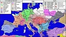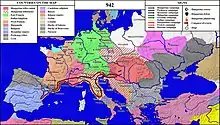 En Provenza, el ejército húngaro luchó con los árabes del enclave musulmán de Fraxinet, cuando Conrado I de Borgoña cayó sobre ellos por sorpresa y derrotó a los dos ejércitos combatientess.[32] | ||||