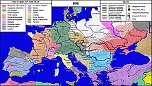 894 | En alianza con Svatopluk I de Moravia, los húngaros atacan la provincia de Panonia de Francia Oriental. Svatopluk muere durante esta guerra.[28] | ![]() Campaña de 894 | ||