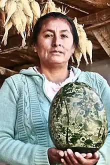 ![]() La artista y ecologista sosteniendo una de sus obras en su casa-taller en Cochas Grande, Junín. | ||
