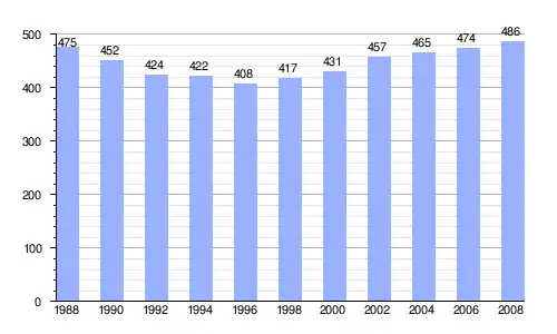 Gráfica de evolución demográfica de Iruraiz-Gauna entre 1988 y 2008 |