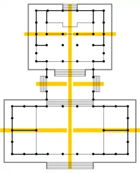 Santuario japonés con un estilo ishi-no-ma-zukuri, también llamado gongen-zukuri. De arriba abajo:honden, ishi-no-ma y haiden. En amarillo las crestas de los tejados.
