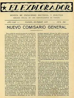 Isidoro de la Cierva (Lobo Blanco) fue un entusiasta propagandista del escultismo. Ingresó en los Exploradores de España en 1915 y fue fundador de la Tropa de Murcia y presidente del consejo local de los Exploradores de España en Murcia.[12] También promotor y fundador del Campamento de Sierra Espuña en 1917,[13] así como la Casa Albergue en el Valle de San Juan en 1927.[14] Entre 1930 y 1931 fue comisario general de la institución,[15] y Juan Antonio Dimas, comisario general suplente. Poseía diversas recompensas y condecoraciones escultistas, a destacar la Medalla de Honor (de oro) del Campamento de Espuña con diez pasadores (1926) y la máxima distinción de los exploradores, el Lobo de Plata (1929).[16][17] Con el cambio de estatutos, fue elegido uno de los cinco comisarios generales (como Secretario-Administrador) en octubre de 1935, sustituyendo al fallecido Severo Montalvo de Águilas.[18]