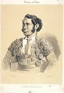![]() Isidro Santiago (Barragán), litografía de Vicente Urrabieta. Ilustración de la Historia del toreo y de las principales ganaderías de España de F. G. de Bedoya, Madrid, 1850. Biblioteca Nacional de España. | ||