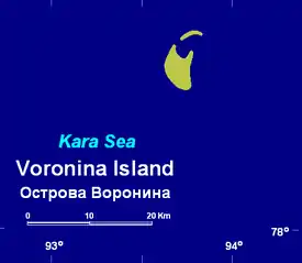 El mar que rodea a estas dos islas solitarias está cubierto de hielo en el invierno y hay numerosos témpanos de hielo incluso en el verano, que dura apenas dos meses. El clima es tan gélido que hay años en que en la latitud de la isla de Voronina las aguas que rodean el mar de Kara no se derriten y se mantienen congeladas durante todo el verano.[1]