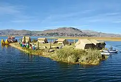 Del tipo flotante también hay islas originadas por la acción humana directa.[20] Un ejemplo de estas son las islas flotantes de los urus, indígenas del lago Titicaca, los que las construyen atando mazos de juncos o totoras secas, hasta formar una forma de balsa sobre la cual construyen sus viviendas y realizan múltiples actividades.[21][22]