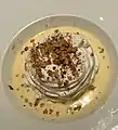 Alternativamente, las claras se pueden moldear con cucharas y se pueden escalfar suavemente en leche endulzada con sabor a vainilla. El flan está cubierto con las albóndigas de clara de huevo.