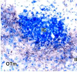 ![]() Imagen de las Islas de Calleja del Cerebro de Rata obtenidas por el equipo de Isabel Úbeda-Bañón. Se aprecian en un color azul intenso, que se ha obtenido por perfusión con dextrano-amina biotinilada. | ||