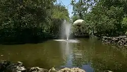 El estanque está delimitado por piedras rústicas y en el centro existe una isla accesible por medio de un puentecillo y otra isla exclusiva para las aves, donde descansan y hacen vida patos, pavos reales, cisnes, las palomas que usan sus árboles para reposar y aprovechan cualquier migaja para alimentarse y algún que otro gallo y gallina. Además de la vegetación hay varios bancos de hierro forjado