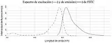 En su espectro de excitación tiene un pico máximo de 492 nm y un pico mínimo de 320 nm. La emisión máxima se realiza a los 518 nm, en la región verde-azulada del espectro, color que puede modificarse al introducir filtros amarillos. El isotiocianato de fluoresceína emite luz verde amarillenta intensa.