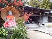 El salón principal se encuentra al otro lado de una pequeña plaza desde la puerta de entrada. Frente a él se encuentra un lavabo de piedra, y en el lado izquierdo de la veranda hay un recinto de madera que alberga una estatua de Binzuru. Unos escalones de piedra conducen al salón Daishi desde la parte occidental del salón principal. Junto a estas escaleras se encuentra una imagen de piedra de Jizō bajo un refugio de madera que tiene la atribución de ser capaz de curar la ceguera.[4][5]