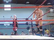 - Cartwheel derivado en over the top rope suicide corkscrew moonsault, back elbow smash, side kick o senton
