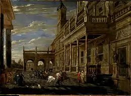 - Attributed to Jacobus Ferdinandus Saey or Jan Baptiste van der Straeten or Jacob Balthasar Peeters, Bordes van een paleis met figuren at the Netherlands Institute for Art History (en Dutch)