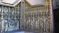 La iconografía de los elementos de los dos artistas fue diseñada para complementarse entre sí, con una secuencia pintada de escenas de la Infancia de Cristo y dentro, escenas talladas de la Adoración de los Magos, la Crucifixión en el centro y el Entierro de Cristo flanqueado por santos en el interior de los paneles laterales. [2] Arriba hay una elaborada tracería gótica con pequeñas figuras de santos y ángeles. El conjunto de ambas obras está dorado o pintado. El Altar de los Santos y Mártires tiene 159 cm de alto, y 252 cm de ancho con los laterales abiertos. El Retablo de la Crucifixión tiene 167 cm de alto y 252 cm de ancho.