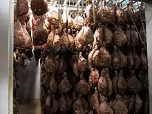 - Se limpia de nuevo y se deja secar a 14 °C con un 70% de humedad durante siete a doce meses, dependiendo de la calidad del cerdo que se utilice y el grado de curación deseado por el fabricante. Durante el secado, se recubre el jamón con una mezcla de grasa y harina de trigo para que no se forme una corteza dura.