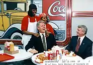 Miller hizo campaña en una plataforma de campamentos de encarcelamiento para delincuentes primerizos de drogas, criticó a Young por "una explosión de crimen" en Atlanta y pintó a Young con el deseo de "huir" del tema de las drogas.[40] Aconsejado por Carville,[41] Miller hizo de una lotería estatal en lugar de los aumentos de impuestos estatales un tema central de su campaña.[42] Carville atribuyó la victoria de once puntos de Miller en las primarias sobre Young al atractivo del tema de la lotería y su capacidad para atraer votantes suburbanos blancos. "Zell Miller pudo establecer la agenda, y la agenda fue la lotería", señaló Carville en ese momento.[43]