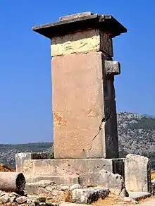 De entre las pilastras de época arcaica sobresale el gran y complejo Monumento de las Harpías.