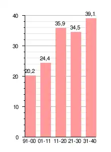 Un importante factor en este en la historia japonesa del primer tercio del siglo XX fue el veloz crecimiento de la población: en 1914 el país contaba con cincuenta y un millones de habitantes, mientras que en 1930 ya tenía sesenta y cuatro millones, un aumento del 25 %.[166][167] Alcanzó los setenta y un millones en 1937.[168] Unas cuatrocientas cincuenta mil personas se sumaban anualmente al mercado laboral en media, una cantidad que la economía absorbía con dificultad, dejando a muchas de ellas con empleos precarios.[166] La gran disponibilidad de mano de obra hacía además que las condiciones laborales fuesen malas: los sueldos tendían a ser bajos y los horarios de trabajo, largos.[166] Pese a todo, los sueldos de los obreros crecieron entre un cincuenta y un sesenta por ciento entre 1914 y 1929; la situación del campesinado mejoró también algo, si bien mucho menos.[167]