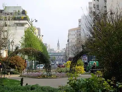 - El parque y la perspectiva de la rue Jeanne d'Arc y de la iglesia Notre-Dame-de-la-Gare.