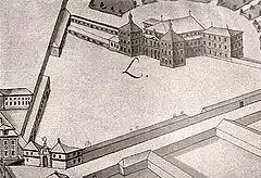 La vista del Complejo Sajón desde el norte pintada en 1764 por Bernardo Bellotto, más conocido como Canaletto el joven, muestra la entrada principal al palacio desde Wielopole con la Puerta de Hierro y el cenador de 21 m de altura llamado Gran Salón.[3]