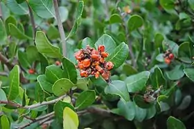 ![]() Un ejemplar de "bayas de limonada" (Rhus integrifolia) planta nativa del sur de California resistente a la sequía. | ||